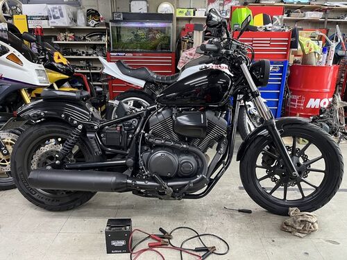 当店ではあまりお目にかからない車両、BOLT950です♪ 走行中に停まってしまい、再始動出ないとのこと(;^ω^) セルボタンを押しても反応がないため、 マグネットスイッチから直で電気を流してみます♪ しーーーーん。。。。。。。 セルが回らなかったので、セル…